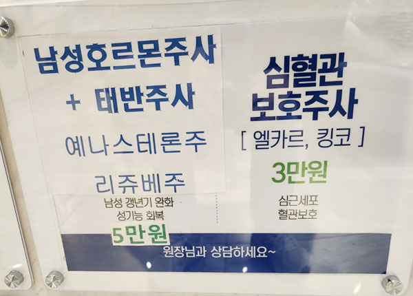 일반 내과, 비뇨기과에 방문하면 남성호르몬 주사와 태반주사를 섞어서 남성 갱년기를 완화해 주고, 성기능을 회복시켜 주는 주사 상품들이 많이 보입니다. 주사를 맞기 전에 담당 의사분과 충분히 상담을 하시는 게 부작용을 예방하는데 도움이 됩니다. 일반적으로 남성호르몬만 포함된 주사인 경우 3만 원부터 많게 까지는 1회당 7만 원까지 합니다.